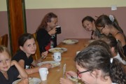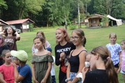 Po přivítání dětí jsme se seznámili, navečeřeli a zahráli první kolektivní hry. Večer jsme se rozdělili do oddílů a podívali jsme se na krátkou upoutávku k celotáborové hře.