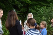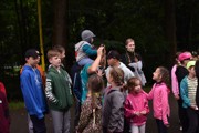 Na ranním nástupu jsme měli vystoupení naších nových vedoucích Laďky a Verči o tom "proč chodit na nástup včas". Poté jsme hráli rychlou hru dostali obrázek místa kde mají schovanou mapu. Tu děti musely najít a podle ní se vydat do lesa. V lese podle mapy našly dopis v lahvi. Poté jsme rozdávali táborové trička a fotily oddíly. Na oběd jsme měli česnekovou polévku a vepřové výpečky se zelím a knedlíkem. Dětem moc chutnalo takže si chodily přidávat.