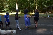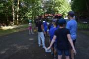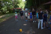 Po ranní rozcvičce a snídani jsme s dětmi zahráli hru kapka štěstí, kde měly děti za úkol oběhnout všech šest stanovišť, dle toho jak jim v danou chvíli přeje štěstí hrací kostka. Odpoledne jsme se vydali do lesa, kde se družiny spojily a připravovaly si hradby, které budou bránit svou vlajku se štítem. Na večerní nástup přišel král Karel IV., který vyhodnotil dopolední hru, úklid pokojů a popřál členovi první družiny k narozeninám.