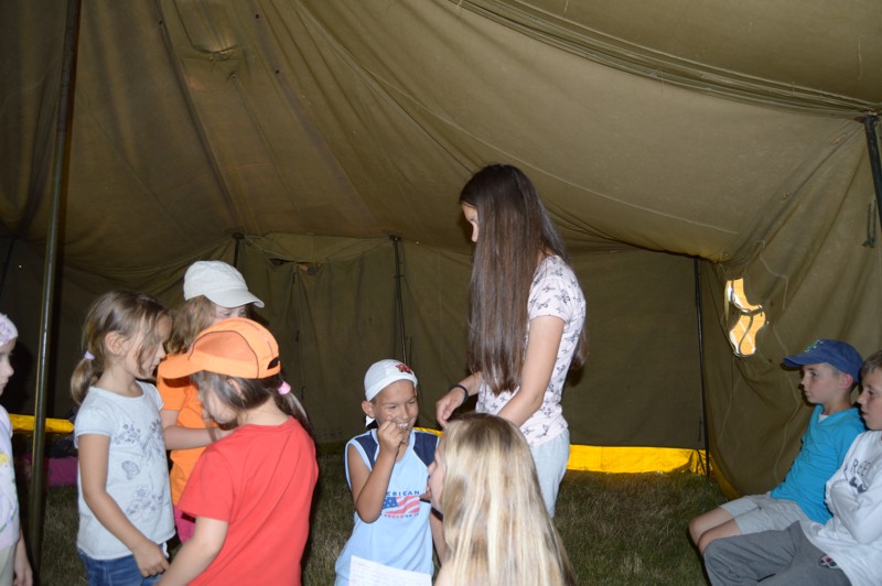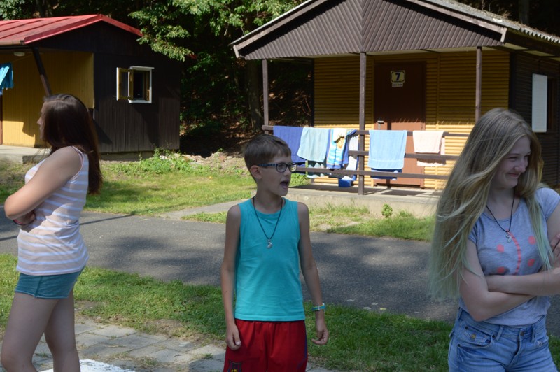 Ráno zase rozcvička ... huráááááááááááááá ... Po snídani jsme začali nacvičovat scénky a batikujeme trička. Je nás moc, tak se na postech střídáme.